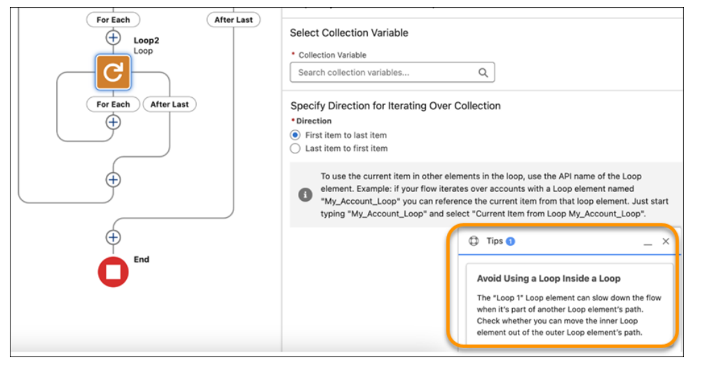 Efficiency tips have been added to Flow Builder, helping identify design issues and optimize your flows. These actionable suggestions, displayed directly on the canvas, help prevent slowdowns and potential Apex governor limit violations.